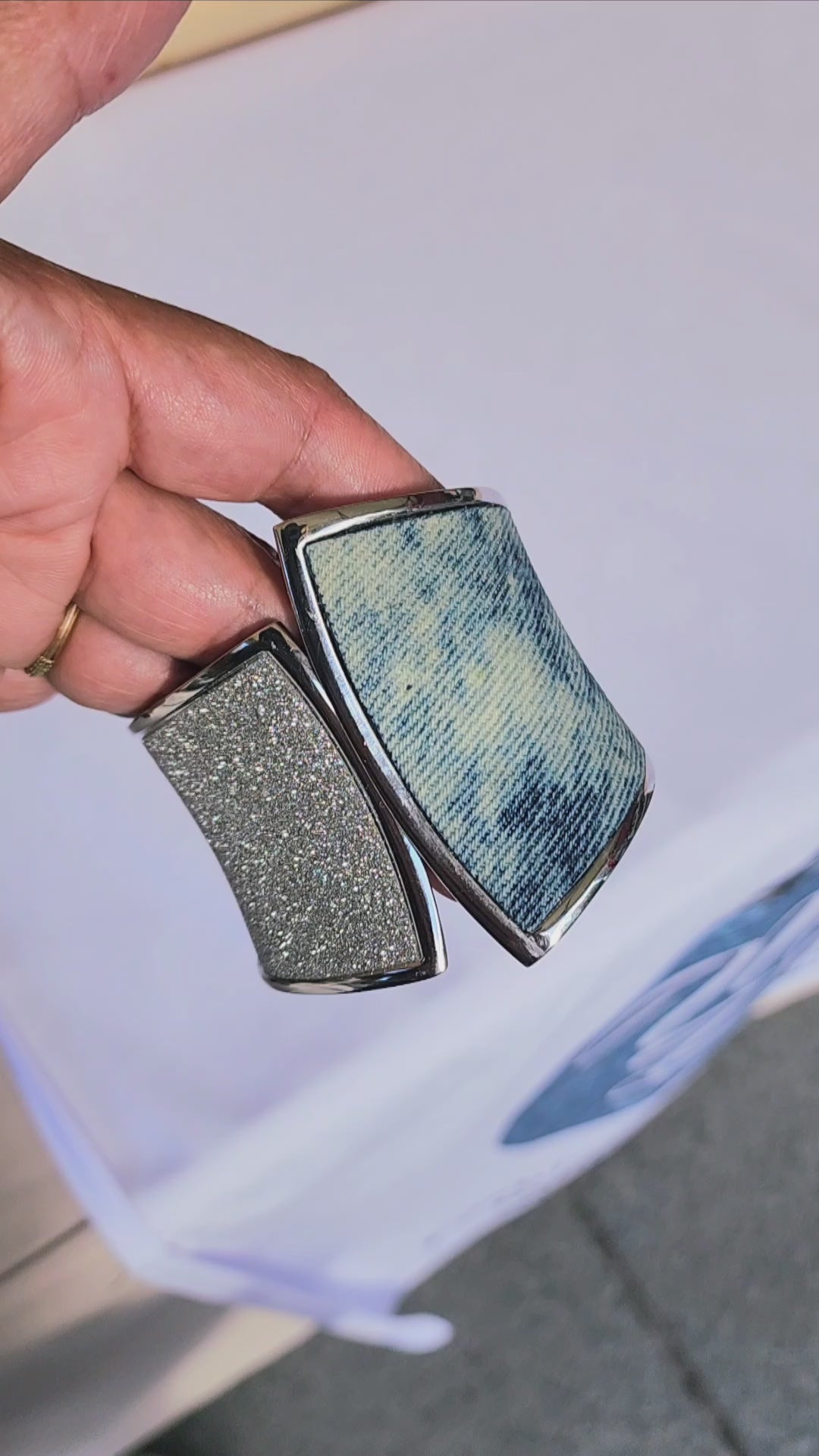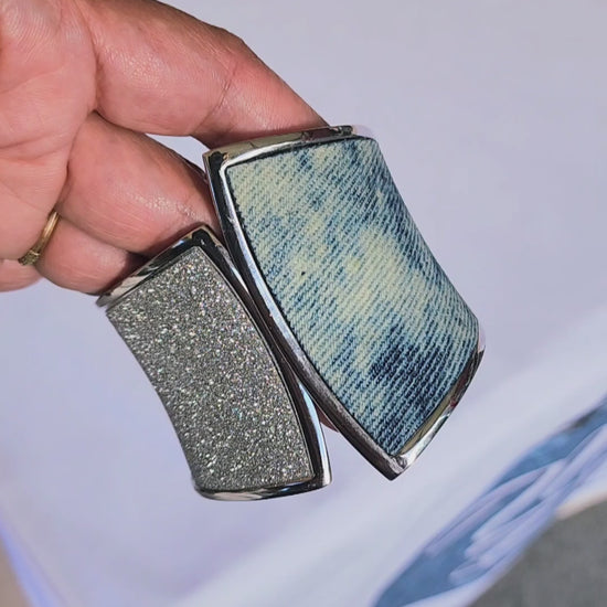 Elevate your accessory game with this standout Denim Bracelet—a bold statement piece that merges 80's vintage charm with modern sparkle. Featuring a lustrous silver-plated cuff, one side showcases authentic acid-washed denim, while the opposite gleams with shimmering silver glitter decal detailing. The convenient hinged opening ensures effortless wear, and the one-size-fits-most design flatters any wrist. Complete your look by pairing it with our matching earrings collection to create a coordinated set that turns heads.