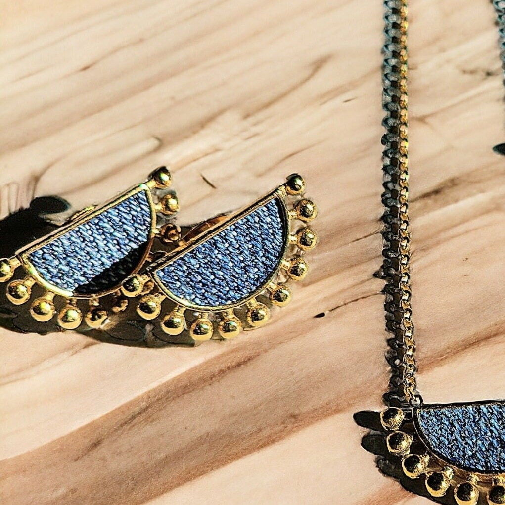 Denim jean fan post Earrings AND Gold stainless steel Necklace SET