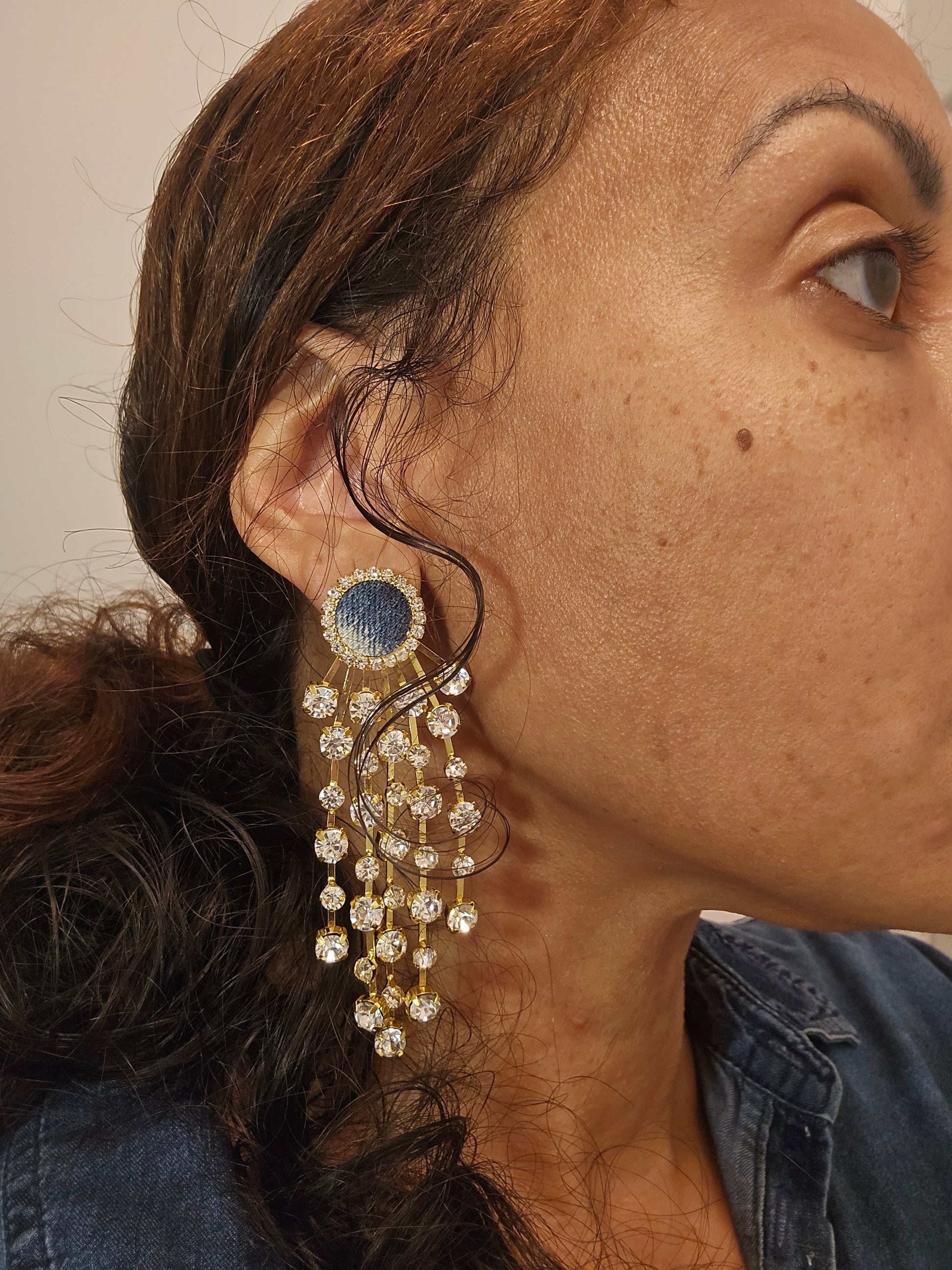 Denim jean round rhinestone post Tassel Earrings