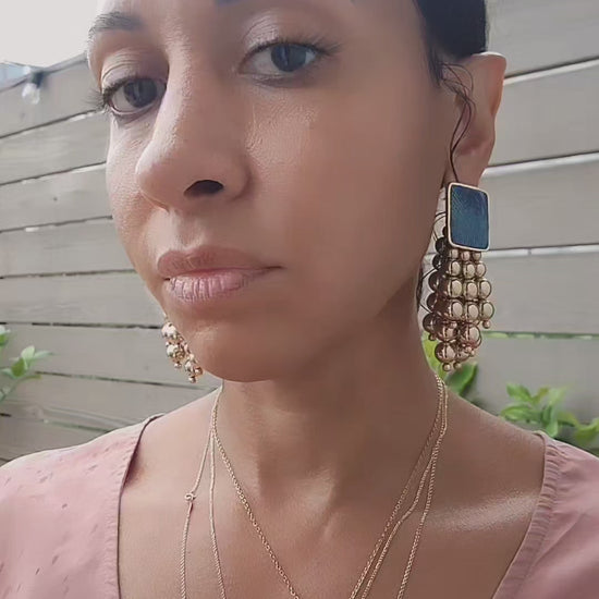 Denim Square Stud Bead Tassel Earrings- Gold plated Jean GOLDEN